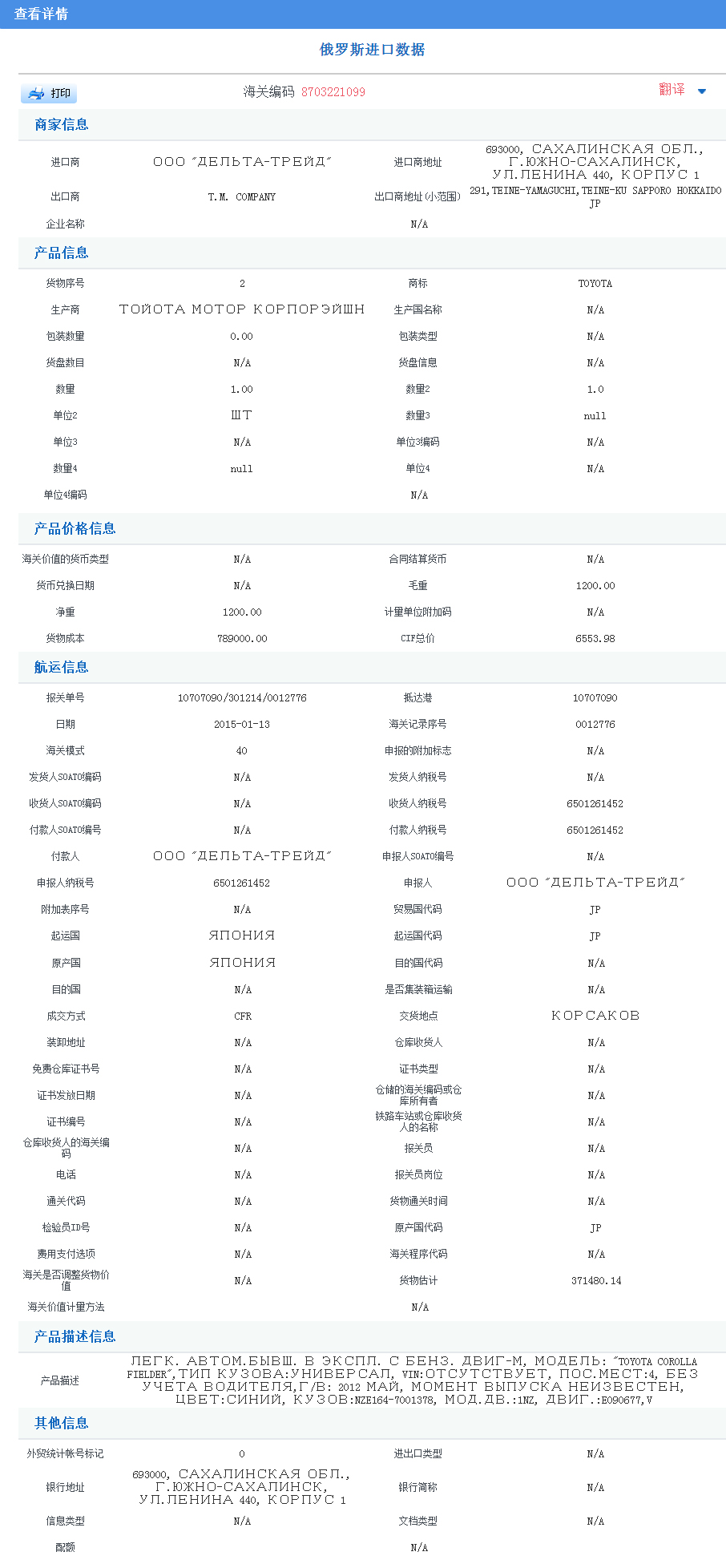 俄罗斯海关数据主要内容包括: 公司信息:进口商、仓库收货人、俄罗斯企业名称、报关员、生产商、供应商 产品信息:HSCODE、产品描述、净重、毛重、数量、商标 价格信息:产品成本、卢布价、产品估价(美元) 俄罗斯海关数据的重点核心字段是:日期、俄罗斯进口商、供应商、HSCODE、产品描述、净重、毛重、数量、产品估值、原产国、中转国 俄罗斯海关数据的文字俄文, 俄罗斯海关数据可以按:HSCODE、产品描述、进口商、供应商、原产国等字段来查询。 因为各国HSCODE略有不同,但前6位是相同的,所以按HSCODE查询时,可以输入HSCODE的前6位作为查询条件。